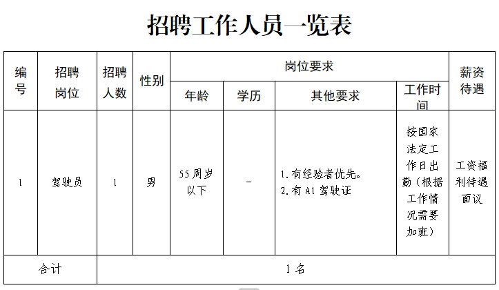 因工作需要,温州经济技术开发区交通建设发展有限公司拟向社会招聘大巴车驾驶员1名(劳务派遣性质,具体岗位详见附件1)。  有意者持本人有效身份证、A1驾驶证、报名表(附件2)等证件、无犯罪记录证明和1寸彩色免冠照片1张到温州经济技术开发区滨海园区滨海十七路350号1509室现场报名。 报名时间:2026年1月26日-2026年1月28日 工作日上午8:30-11:30,下午13:30-17:00,联系电话:15990739166 经资格审查后确定为意向人选的,另行电话通知面谈,现场进行考核。 附件1:招聘工作人员一览表 附件2:招聘编外人员报名表 温州经济技术开发区交通建设发展有限公司 2026年1月23日 |